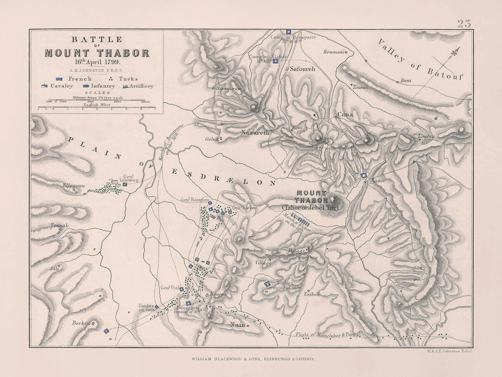 Présentation de la « Bataille du Mont Thabor, 16 avril 1799 », une lithographie historique détaillée représentant les manœuvres stratégiques des forces françaises et turques engagées sur ce champ de bataille important. Réalisée par le réputé AK Johnston en 1799, cette gravure ancienne colorée à la main capture magnifiquement la disposition de la cavalerie, de l'infanterie et de l'artillerie, enveloppée dans les complexités de la guerre gravées dans le paysage historique.