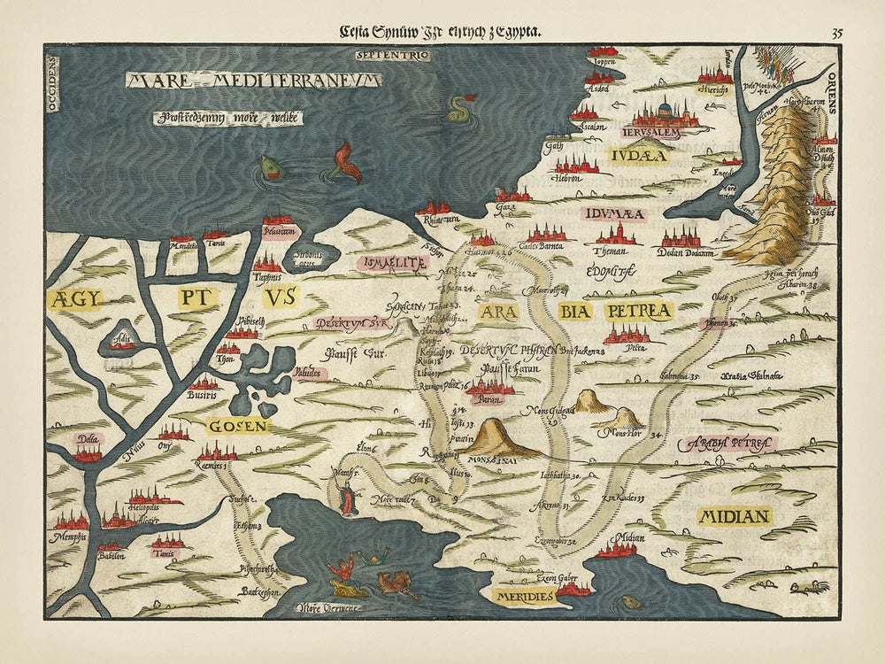 L'Exode israélite d'Égypte par Bunting: Carte de l'ancienne route, Pharaon se noyant dans la mer Rouge, Pharaon Jérusalem, Sinaï, Goshen