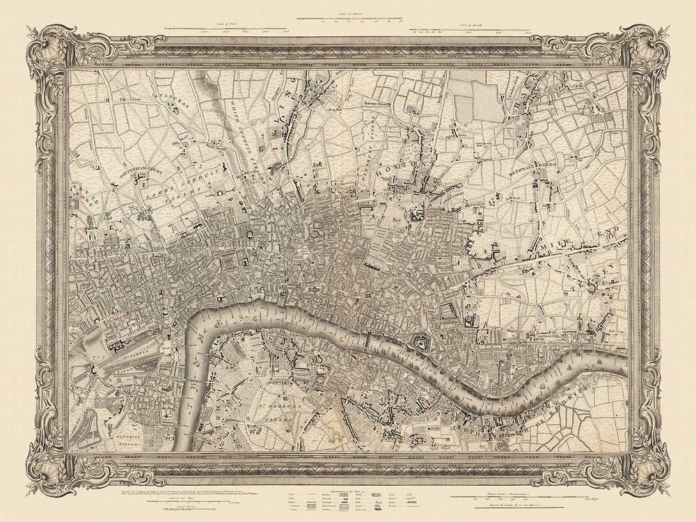 Cette carte du centre de Londres couvre de nombreux arrondissements de l'intérieur de la ville d'aujourd'hui, tels que l'arrondissement de Southwark, l'arrondissement de Lambeth, la ville de Westminster, la ville de Londres, l'arrondissement d'Islington, l'arrondissement de Tower Hamlets et l'arrondissement de Camden.