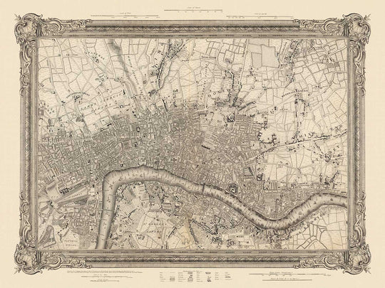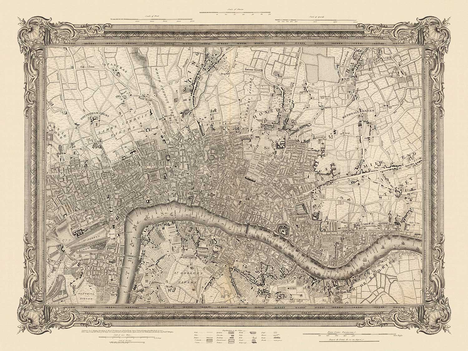 Publié il y a presque 300 ans par le maître cartographe John Rocque, ceci est la première carte détaillée du centre de Londres et de Londres intérieur. Elle a été publiée à l'origine en 1746, suite à une enquête très précise de Londres et de ses banlieues débutée en 1740. C'est une belle carte ancienne, très détaillée et extrêmement rare.