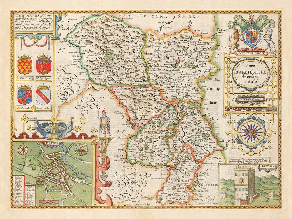 En bas à gauche se trouve une gravure détaillée de Derby, la ville du comté. Une grande partie du Peak District moderne figure sur cette carte - bien qu'à l'époque, il était simplement appelé Peake Forest.