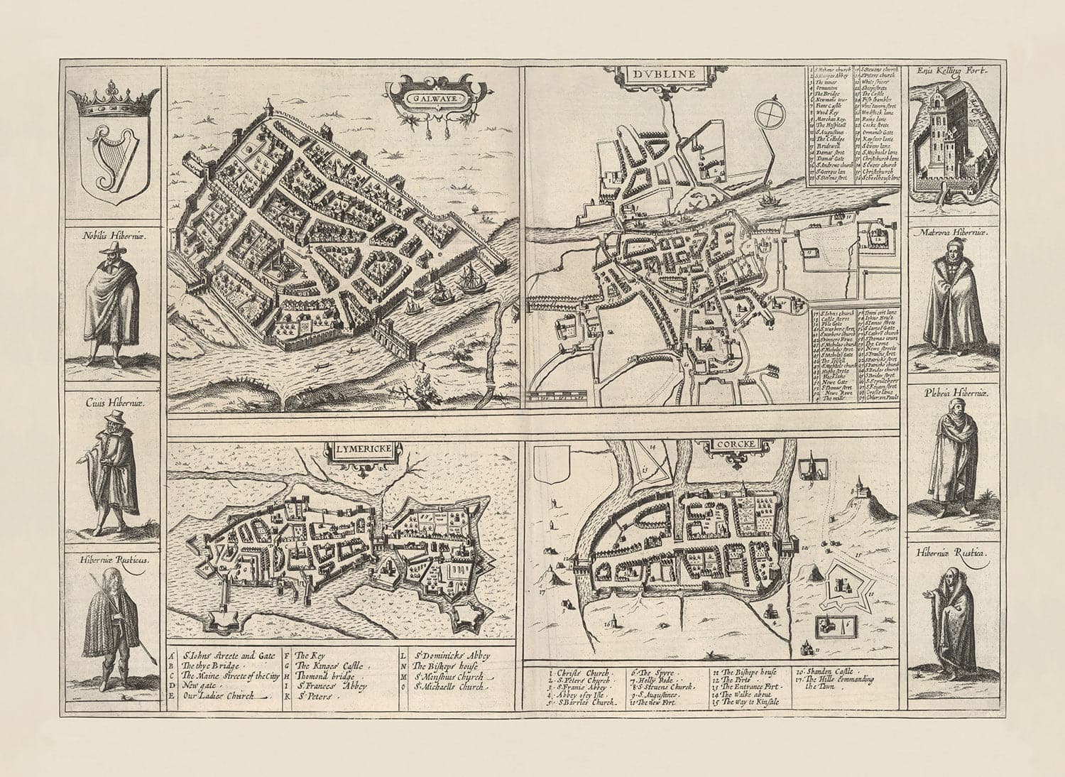 Ancienne carte de Dublin, Limerick, Cork et Galway en 1618 par Georg Braun: Anciennes cartes de la ville d'Eire