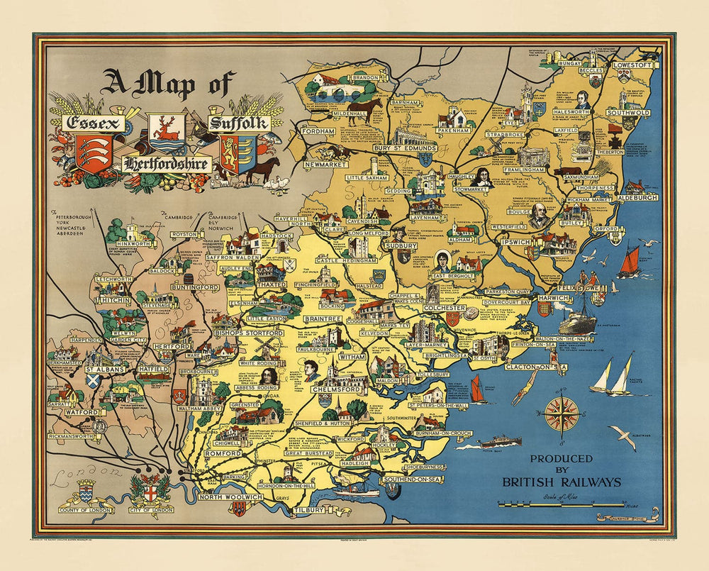 Peut-être que surtout, chacune des principales villes et villes de la région est représentées par un croquis de leur highstreet ou un bâtiment important, ainsi que les armoiries s'ils en ont une - et un peu d'informations intéressantes.