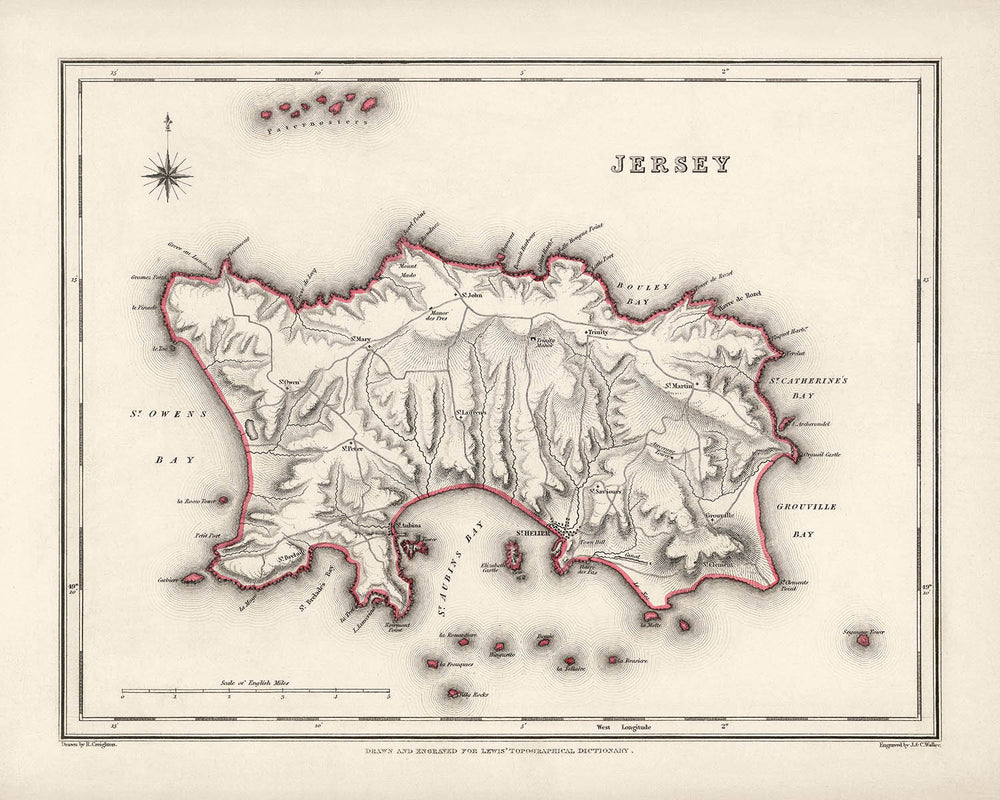 Cette vieille carte de Jersey méticuleusement réalisée par Samuel Lewis en 1844 offre un aperçu captivant du paysage historique de l'île de Jersey, dans les îles anglo-normandes. Avec ses détails complexes et son art cartographique exquis, cette carte est une véritable pièce de collection. Présentant les principales villes et autres caractéristiques fascinantes de Jersey, cette carte présente la riche histoire de l'île. Il est important de noter que certaines villes modernes peuvent ne pas être représentées sur cette carte, tandis que d’autres peuvent apparaître sous des noms antérieurs, ajoutant ainsi une signification historique passionnante. La vieille carte de Jersey réalisée par Samuel Lewis en 1844 sert de fenêtre sur le passé, vous permettant d'explorer le patrimoine de l'île et de retracer l'évolution de ses colonies. Vous trouverez ci-dessous une liste complète de 30 villes, comtés, colonies et colonies remarquables fondés avant 1840 et situés dans les limites historiques de l'île de Jersey, îles anglo-normandes :