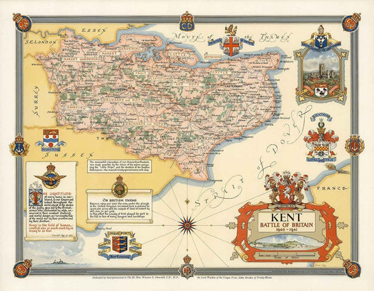 En plus d'une carte détaillée du comté au milieu, Clegg a orné cette carte d'un certain nombre d'illustrations très détaillées et très attrayantes de choses liées au Kent. Celles-ci incluent une vue détaillée de Canterbury, les falaises blanches du Kent et la "Bataille d'Angleterre", ainsi qu'un destroyer en mer. Il y a aussi d'autres éléments de la Seconde Guerre mondiale et une citation de Winston Churchill - celle qui dit "jamais dans le domaine du conflit humain tant n'a été dû par tant à si peu".