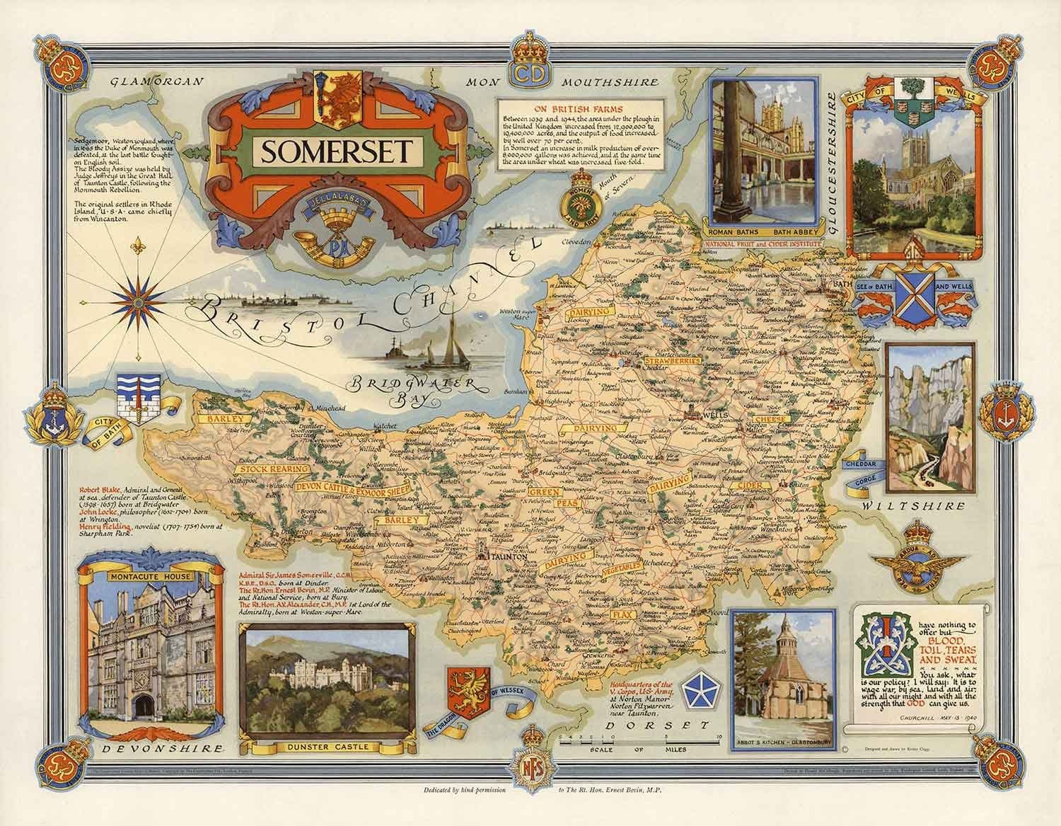 Une carte charmante sur le thème de la Seconde Guerre mondiale du Somerset, publiée en 1946 par l'un des meilleurs cartographes des années 1900, Ernest Clegg.