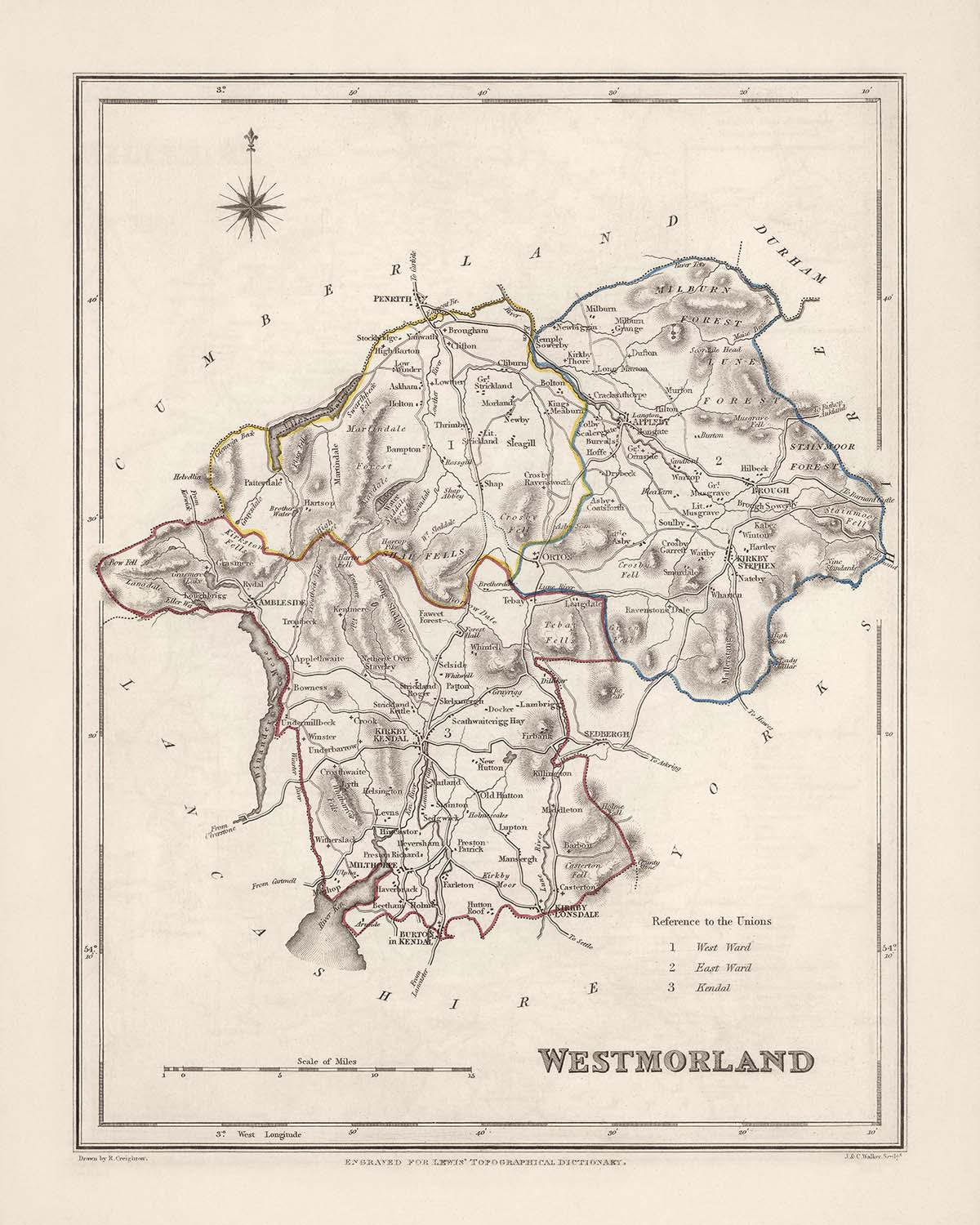 Ancienne carte de Westmorland par Samuel Lewis, 1844 : Appleby, Kendal, Kirkby Stephen, Brough, Lake District