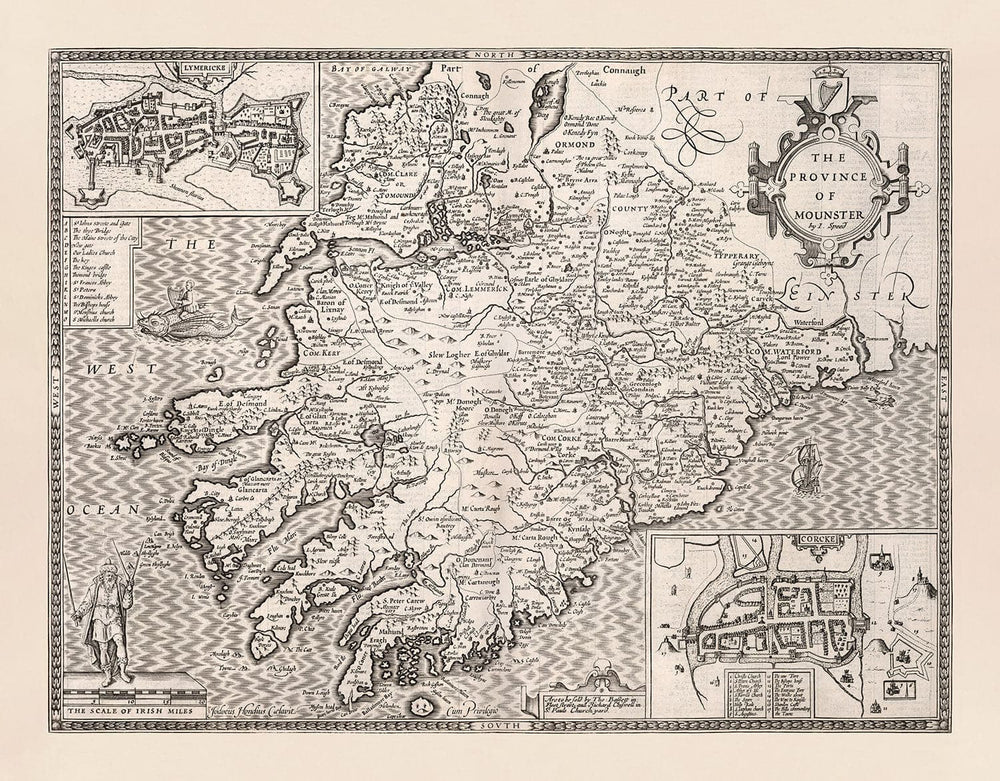 De nombreuses villes, villages, cités et comtés de Munster sont déjà visibles sur cette carte, y compris Cork, Limerick, Kerry, Tipperary, Waterford et Clare.