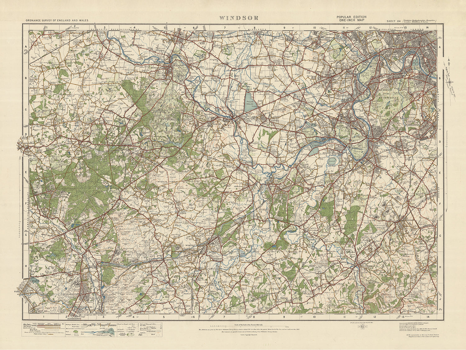 Carte Old Ordnance Survey, feuille 114: Windsor, 1925 : Woking, Farnborough, Slough, Bracknell, Richmond
