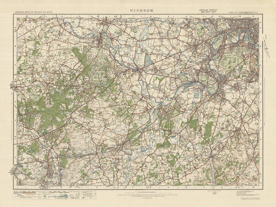 Cette carte Old Ordnance Survey, feuille 114 - Windsor, 1925, offre un aperçu fascinant du passé, mettant en valeur les villes et les caractéristiques intéressantes de Windsor et de ses environs. La carte, qui fait partie de l'édition « Populaire » d'un pouce pour l'Angleterre et le Pays de Galles, publiée en 1925, fournit un aperçu détaillé de la région à cette époque.