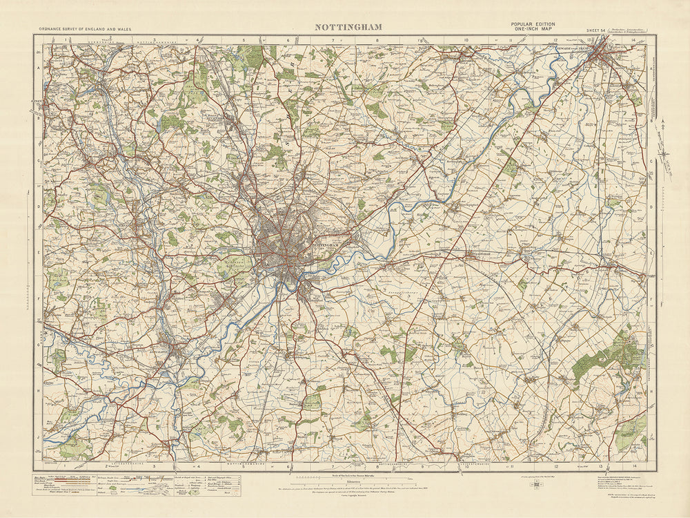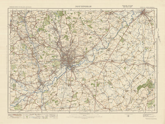 La « Old Ordnance Survey Map, Sheet 54 - Nottingham, 1925 » est un morceau fascinant de l'histoire cartographique qui fournit un aperçu détaillé de Nottingham et de ses environs au début du 20e siècle. Cette carte, qui fait partie de l'édition « Populaire » d'un pouce pour l'Angleterre et le Pays de Galles, offre une mine d'informations sur les villes et les caractéristiques intéressantes qui étaient présentes à l'époque.