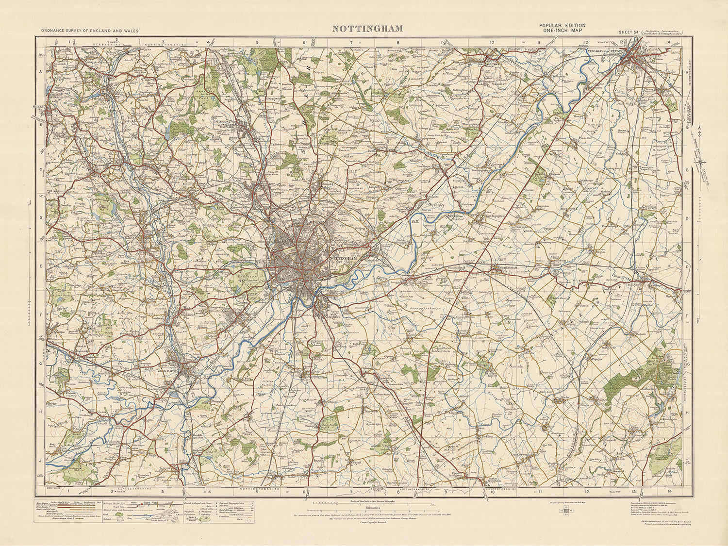 Carte Old Ordnance Survey, feuille 54: Nottingham, 1925 : Ilkeston, Heanor, Long Eaton, Newark-on-Trent, Southwell