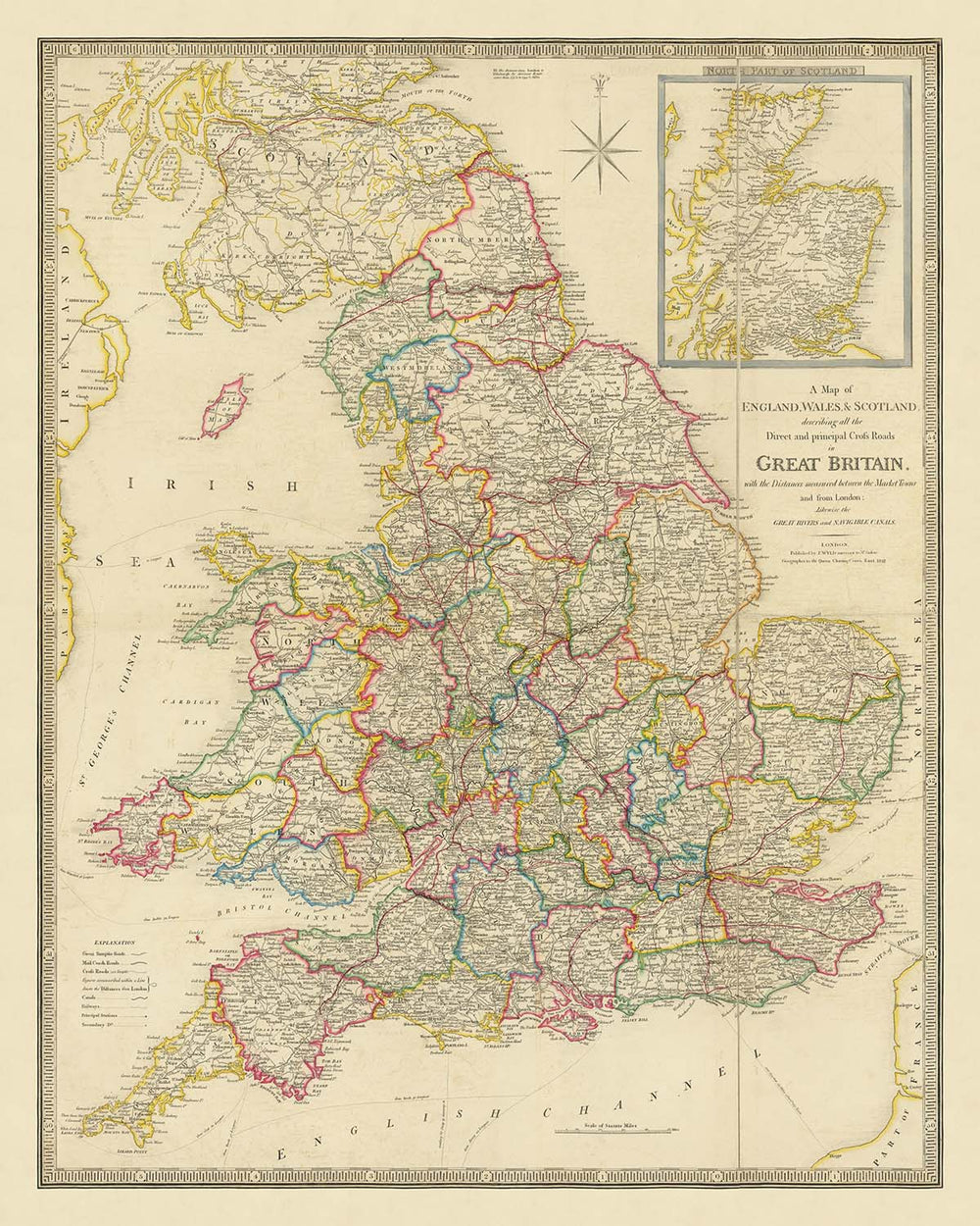 La grandeur de cette carte réside dans sa représentation complète de l'Angleterre, du Pays de Galles et de l'Écosse, chaque frontière de comté clairement délimitée. La carte est un véritable catalogue des villes et villages les plus significatifs de l'époque : Londres, Birmingham, Manchester, Liverpool, Glasgow, Édimbourg, Cardiff et bien d'autres, chacun jouant son rôle dans l'histoire de la transformation de la Grande-Bretagne. Ces établissements, aujourd'hui des métropoles florissantes, sont présentés dans leur contexte historique, reliés par les artères mêmes qui ont alimenté la croissance et la prospérité de la nation.