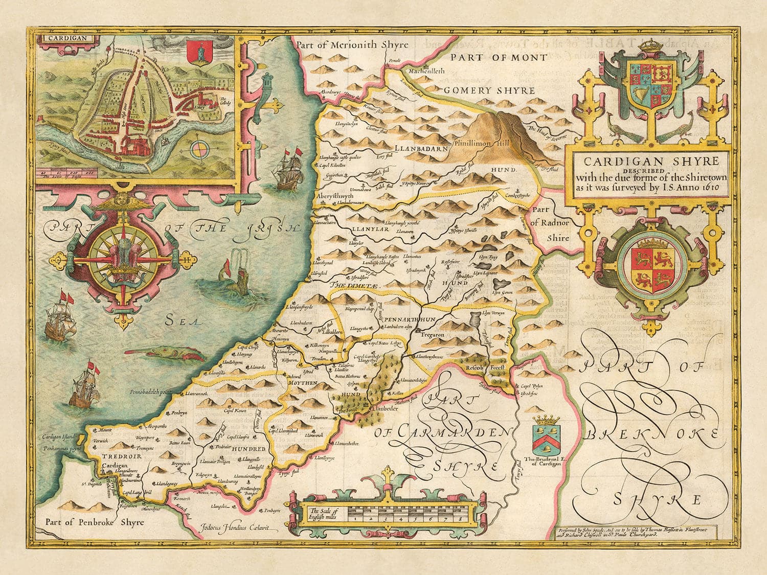Ancienne Carte de Ceredigion Galles, 1611 par John Vitesse: Cardiganshire, Aberystwyth, Cardigan
