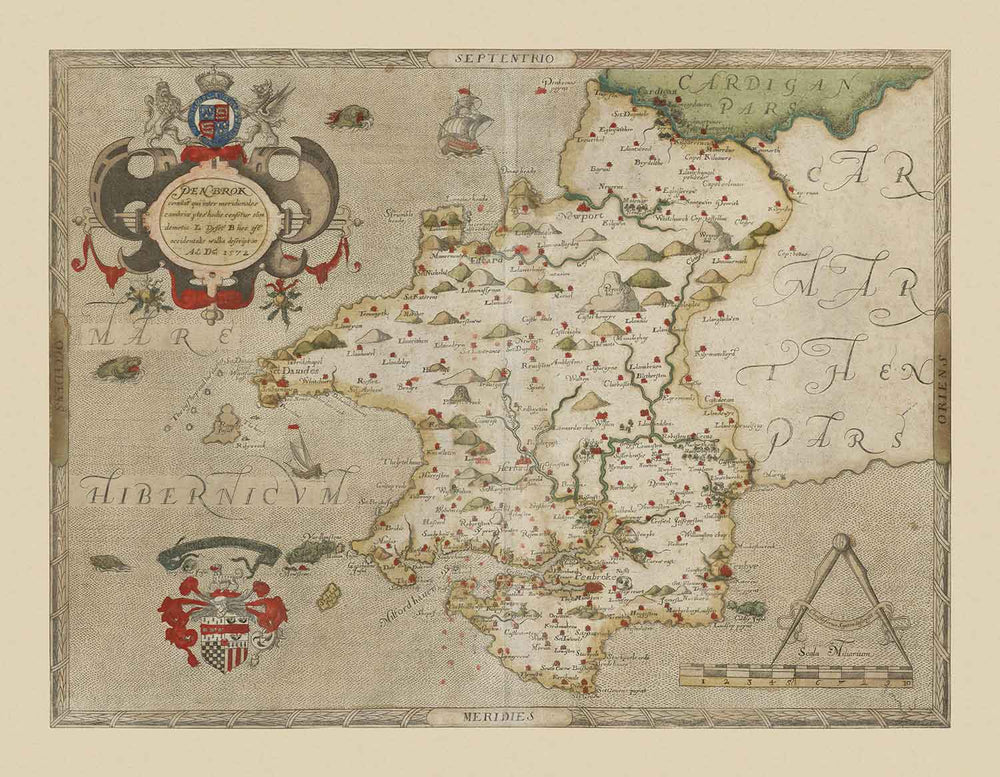 Ancienne carte du Pembrokeshire, Pays de Galles en 1578 par Christopher Saxton: Pembroke, Newport, Cardigan, Fishguard, Haverfordwest
