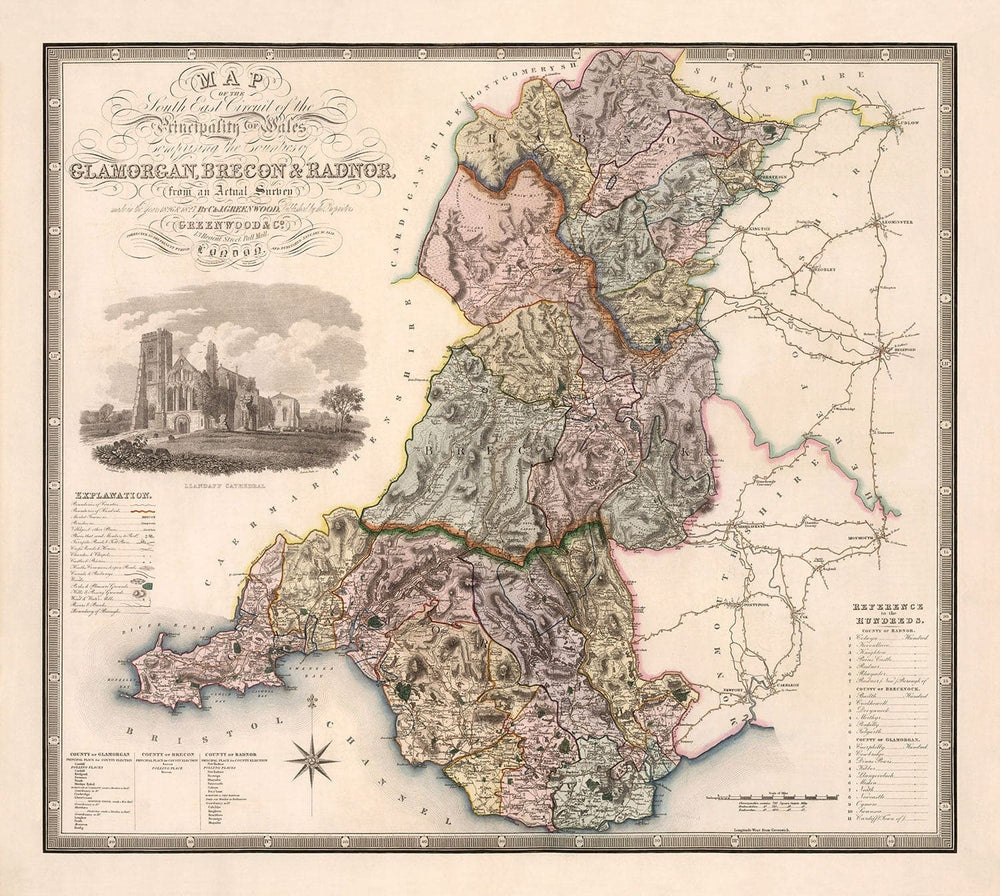 Cette vieille couleur pleine couleur et une merveilleuse carte montre les parties sud-est de la Principauté du Pays de Galles, notamment Glamorganshire, Brecon et Radnorshire, ainsi que les principales villes de Cardiff et de Swansea. Publié dans l'Atlas d'Angleterre de Greenwood de Greenwood et gravé par J & C Walker, c'est l'une des plus belles cartes de comté de la région des années 1800.