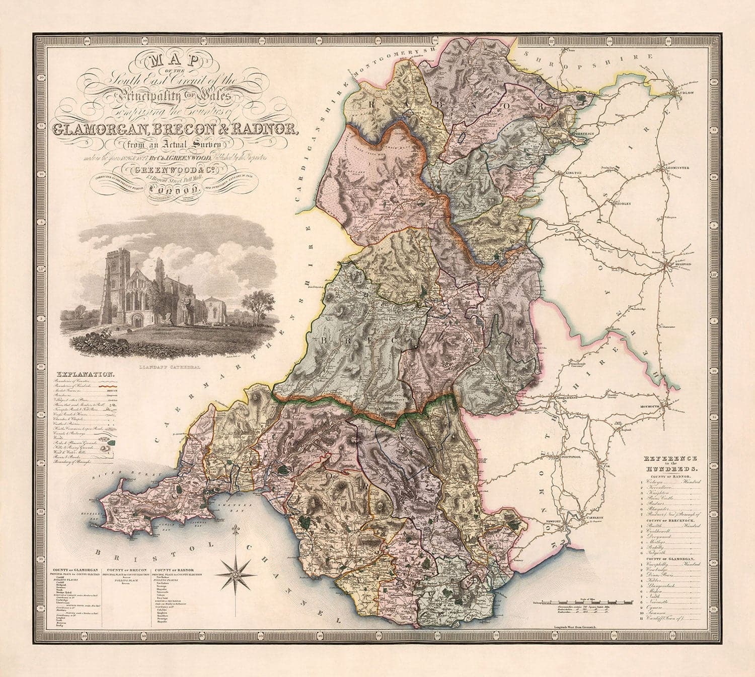Ancienne carte de South Wales, 1829 par Greenwood & Co.: Glamorgan, Cardiff, Brecon, Swansea