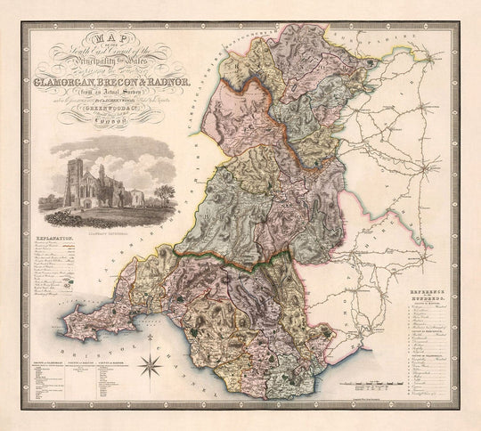 Sur le côté gauche de la carte se trouve une gravure détaillée de la cathédrale de Llandaff à Cardiff.