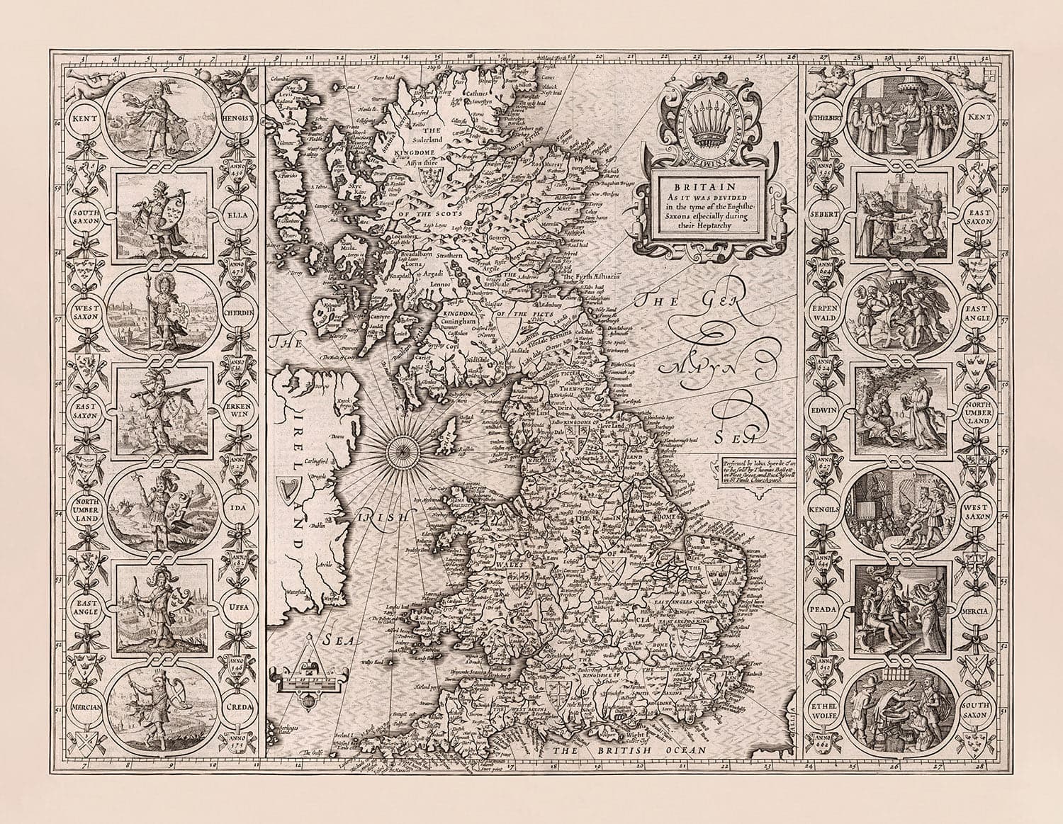 Ancienne carte viking de l'Angleterre, du Pays de Galles et de l'Écosse, 1611 par John Speed: Carte de l'Heptarchie anglo-saxonne de la Grande-Bretagne
