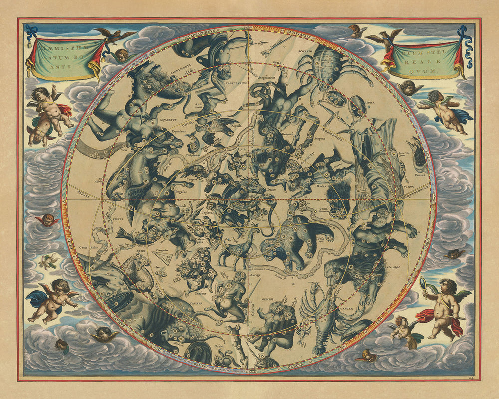 Ce qui distingue cette carte céleste, c'est son riche détail et sa vibrante coloration à la main, attribués à l'un des meilleurs coloristes néerlandais du XVIIe siècle. Les éléments décoratifs, mettant en vedette des chérubins et des incarnations astrales, ajoutent une dimension enchanteresse à la représentation scientifique des constellations. La carte fournit une représentation élaborée et mise à jour des constellations de l'hémisphère nord, en faisant à la fois un artefact historique et une œuvre d'art.