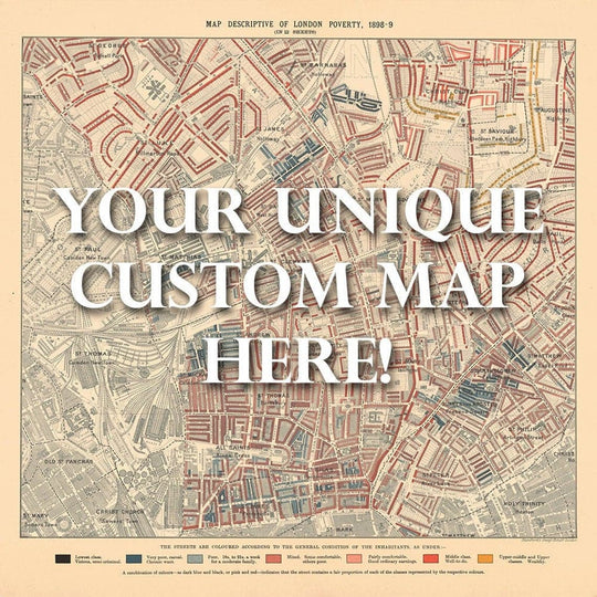 Créez et possédez une carte historique personnalisée et unique de la Carte de la pauvreté de Londres, créée par Charles Booth en 1898-99. Vous pouvez commander une carte carrée, portrait ou paysage.