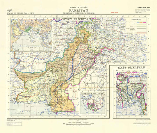 Notamment, c'est la première carte du Pakistan en tant qu'état indépendant, ayant rompu avec l'Inde après la chute du Raj britannique en 1947.