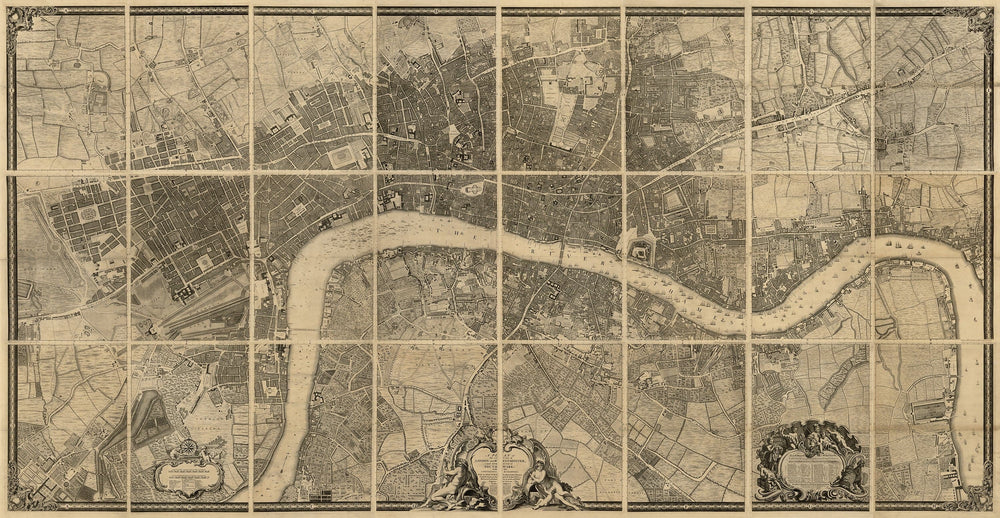 - Carte de Londres, Westminster et Southwark de John Rocque, 1746. Il s'agit de la carte originale (et probablement la meilleure) du vieux Londres. Il était à l'origine imprimé en 24 feuilles et mesurait 4 mètres de large. Je peux recréer la carte entière pour vous - ou si vous n'avez qu'un espace carré, nous pouvons créer une version personnalisée qui s'adaptera parfaitement.