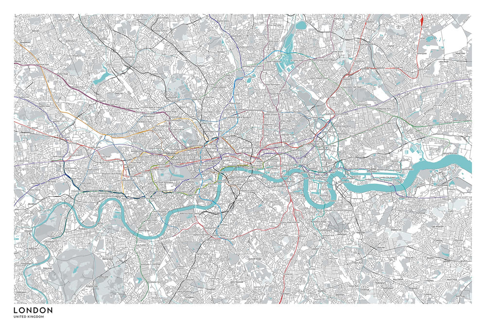 • Nom de la carte : Carte Moderne de Londres avec de Vraies Routes de Métro