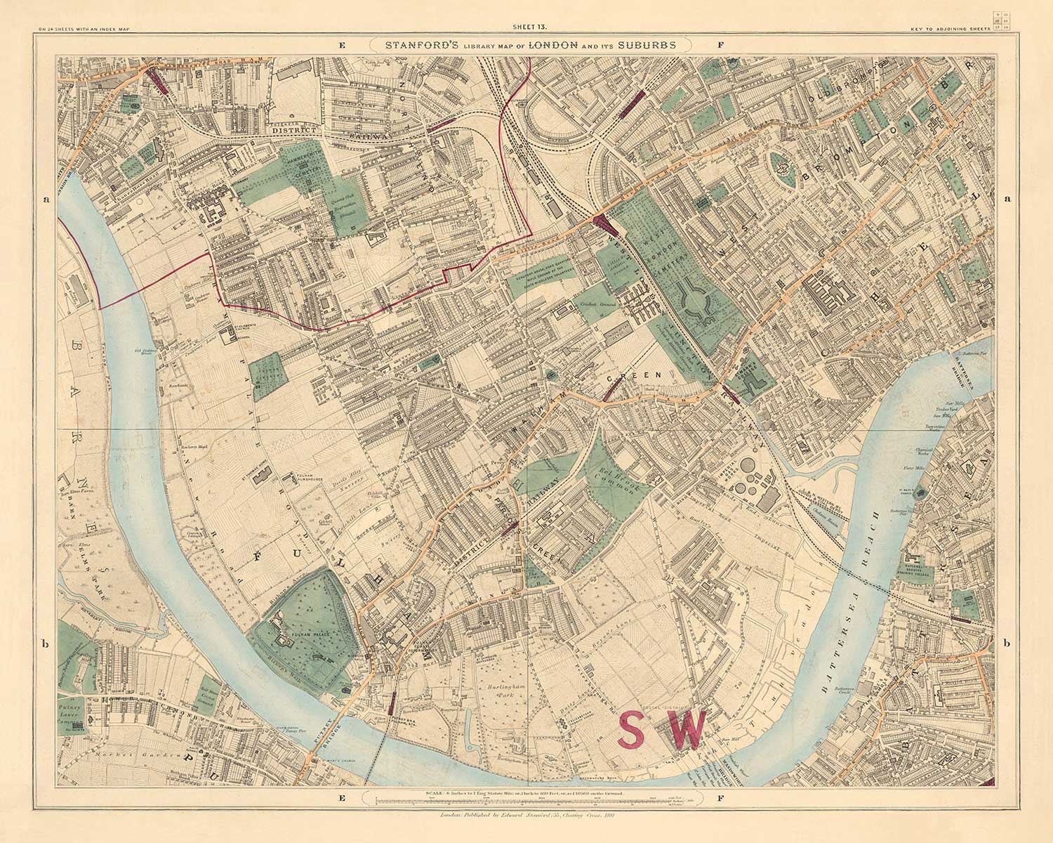 La carte a été initialement publiée en 24 feuilles. Au total, la carte mesurait environ 2 mètres de large (78 pouces). Voici la feuille 13, qui se concentre sur l'ouest de Londres, spécifiquement Fulham et West Brompton, avec des morceaux de Hammersmith, Chelsea, Battersea et Putney.