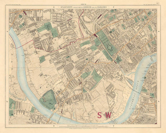 Initialement saluée comme "la carte la plus parfaite de Londres qui ait jamais été publiée" par la Royal Geographical Society lors de sa publication en 1862, il est sûr de dire que la carte de Londres d'Edward Stanford était un chef-d'œuvre de la cartographie. Voici une magnifique carte colorée à la main de l'édition de 1891 de la carte de Stanford.