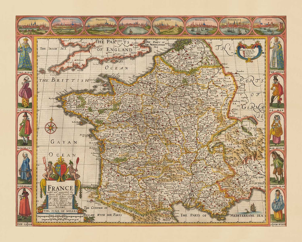 Autour du bord de la carte se trouvent de merveilleuses gravures de villes françaises telles que Calais, Paris, Bordeaux et Poitiers - ainsi que des dessins du peuple français, y compris le Roi, la Reine, le 'Gentilhomme' et le 'Marchand'.