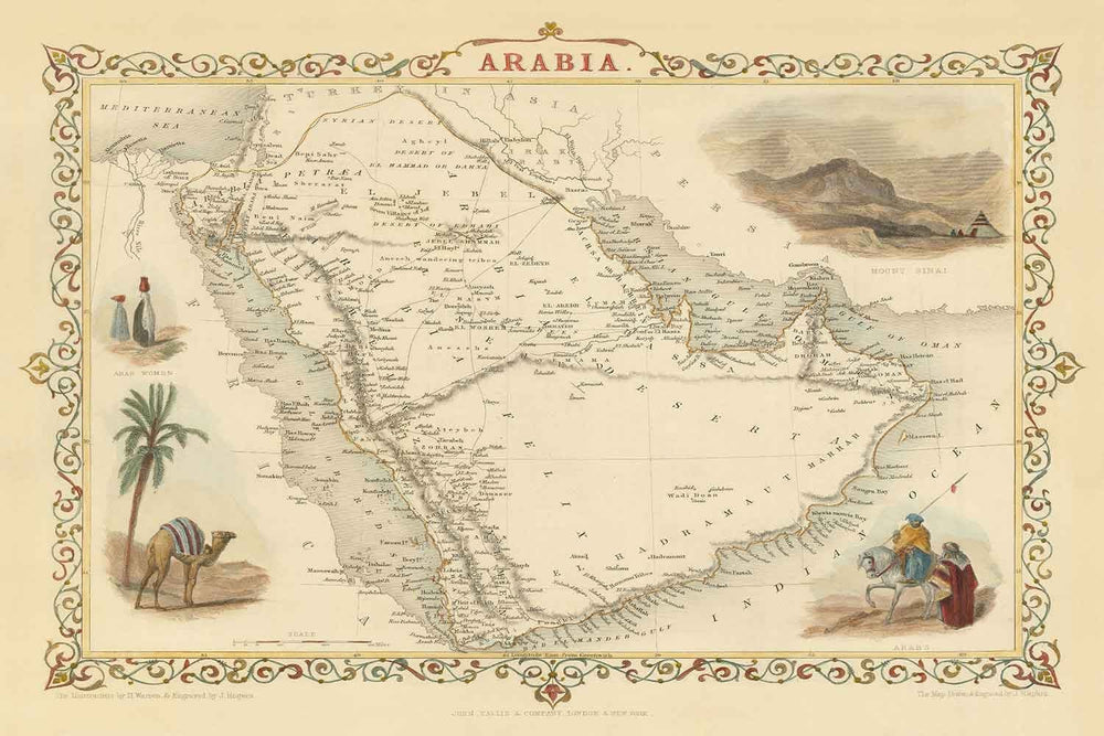 Gravé par John Rapkin et publié par J. Tallis & Co en 1851, c'est l'une des cartes historiques les plus fines et les plus détaillées de la péninsule arabique, ou simplement "Arabie" comme on l'appelait à l'époque.
