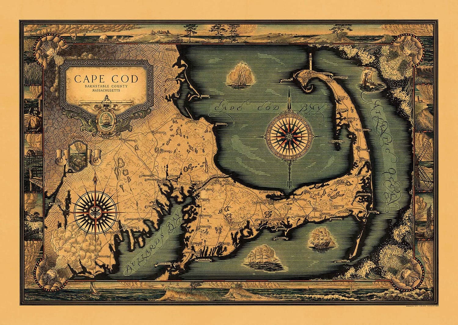 Une magnifique carte picturale couvre l'ensemble de Cape Cod et de la baie de Cape Cod, le comté de Barnstable, ainsi qu'une partie du continent dans le comté de Plymouth et le comté de Bristol.