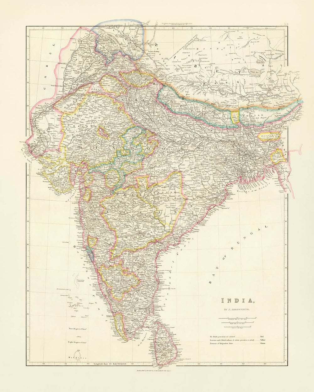 La carte 'Inde, Pakistan & Bangladesh' de John Arrowsmith, 1857, englobe un large éventail de caractéristiques géographiques et historiques. Voici quelques-uns des aspects notables couverts par cette carte, classés par pays :