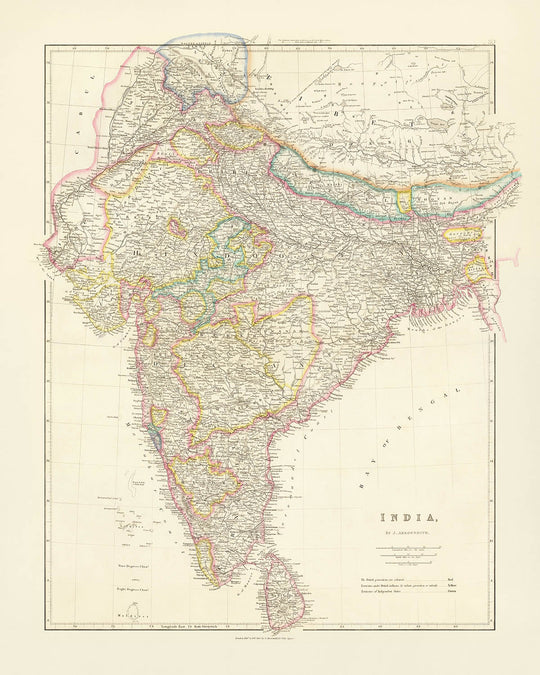 Enfin, la carte 'Inde' se distingue comme une carte de pays intéressante en raison de sa couverture complète de la région. Elle ne se limite pas à la représentation des caractéristiques politiques et physiques de l'Inde, du Pakistan et du Bangladesh, mais s'étend pour inclure les régions significatives de Ceylan, du Tibet et du Népal. Cette large portée, combinée à l'attention méticuleuse d'Arrowsmith aux détails, aboutit à une carte à la fois informative et intrigante. Elle invite le spectateur à explorer la riche histoire et la géographie diversifiée de l'Asie du Sud, en faisant un ajout précieux à toute collection.