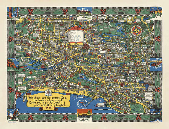 Ancienne carte de Melbourne, Victoria par John Power Studios, 1934: Centre-ville, gare, parcs, zoo, plage, rivière Yarra