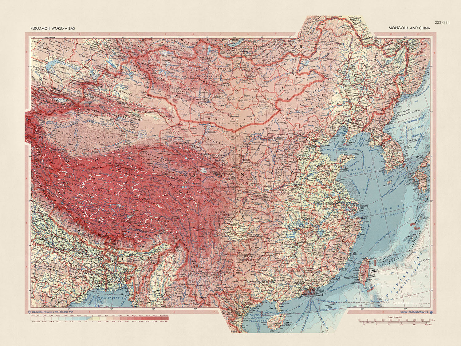 Vieille carte de la Mongolie et de la Chine, 1967: Corée, Taïwan, atlas politique et physique détaillé