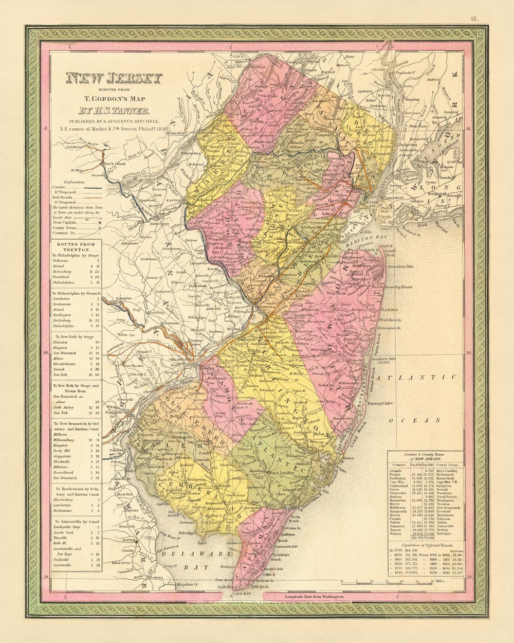 Ancienne carte du New Jersey par Tanner, 1847 : Garden State, New York, Philadelphie, Trenton, Princeton et Camden