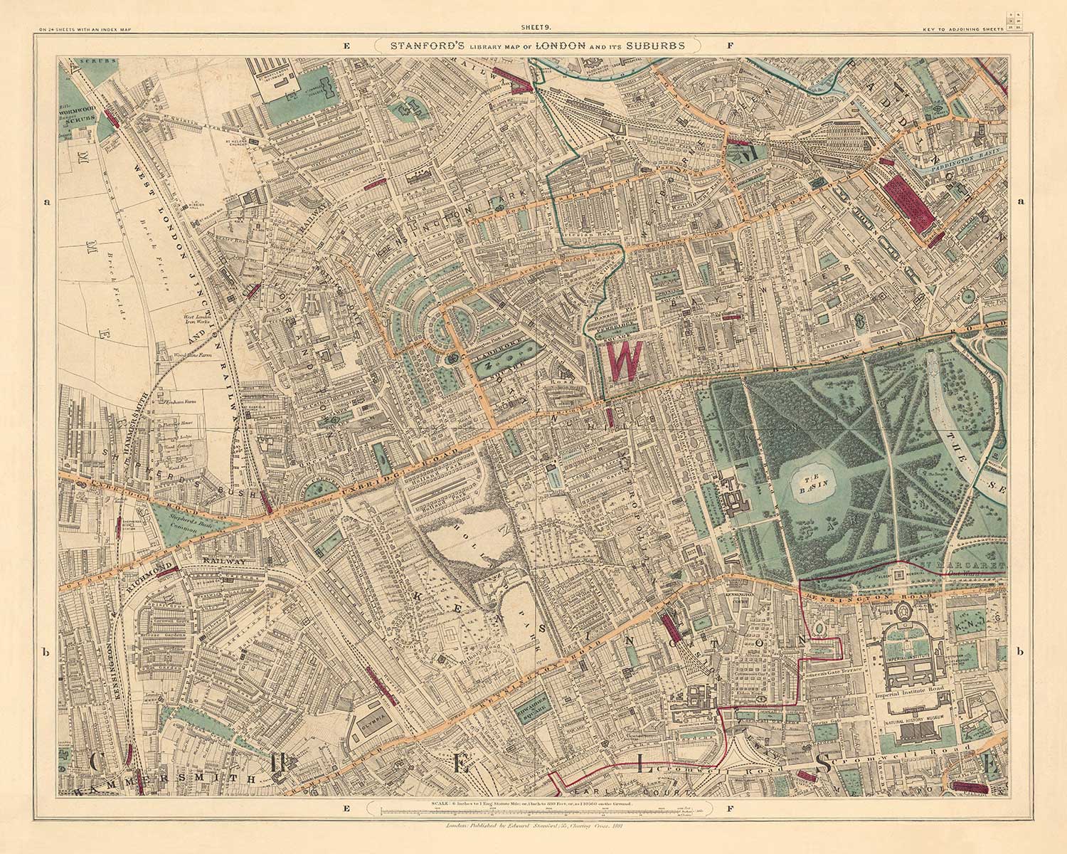 La carte a été publiée à l'origine en 24 feuilles. Au total, la carte mesurait environ 2 mètres de large (78 pouces). Voici la feuille 9, qui se concentre sur Notting Hill, Bayswater, Kensington et d'autres parties de l'ouest de Londres.