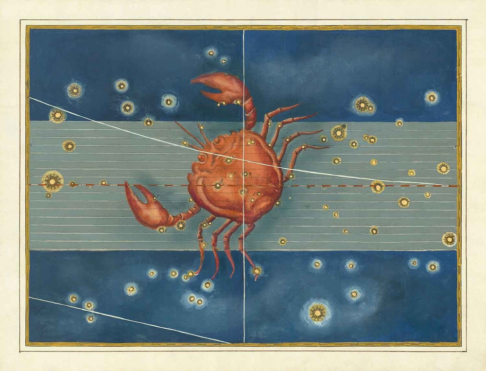 Cette carte des étoiles a été publiée pour la première fois en 1603 dans "Uranometria" de Johann Bayer, peut-être l'atlas stellaire le plus influent jamais publié et le précurseur de tous les atlas d'étoiles modernes. Il contenait 51 cartes d'étoiles très précises, dont 48 étaient les constellations ptolémaïques. Et, bien sûr, les 12 signes majeurs du zodiaque, y compris ce joli Cancer, étaient tous inclus.