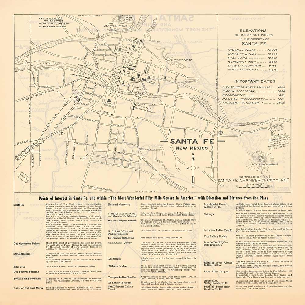 La carte déclare fièrement qu'elle montre Santa Fe et "le plus merveilleux carré de cinquante miles en Amérique", bien qu'il ne soit pas vraiment clair qui a dit cela à propos de Santa Fe.