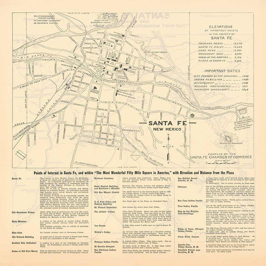 La carte montre également les distances vers d'autres villes et monuments en dehors de Santa Fe, quelques dates importantes (Santa Fe a été fondée à l'origine en 1609 par les Espagnols, ce qui en fait le plus ancien siège de gouvernement aux États-Unis)... et plus encore !