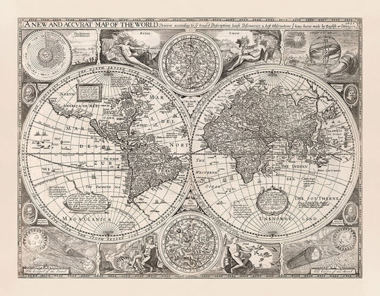 En 1651, notre compréhension du monde n'était pas tout à fait ce qu'elle est aujourd'hui. La Californie est une île ! Et il n'y a pas d'Antarctique ni d'Australie - juste la 'Terre Inconnue du Sud'. Regardez de plus près l'Amérique du Nord et il y a quelques très anciennes colonies - y compris certaines qui ont été complètement fabriquées par le cartographe ! Et pourquoi l'Amérique du Nord s'incline-t-elle si sauvagement vers l'ouest dans le coin supérieur ?