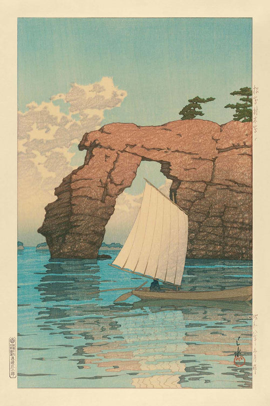 Découvrez la beauté sereine de "Voilier et l'île Zaimoku à Matsushima" par l'artiste acclamé Hasui Kawase. Réalisée en 1935, cette magnifique estampe sur bois est une représentation splendide de l'approche poignante de Kawase en matière de représentation des paysages, capturant la beauté tranquille de l'île Zaimoku avec ses eaux ondulantes et ses teintes bleues dominantes.