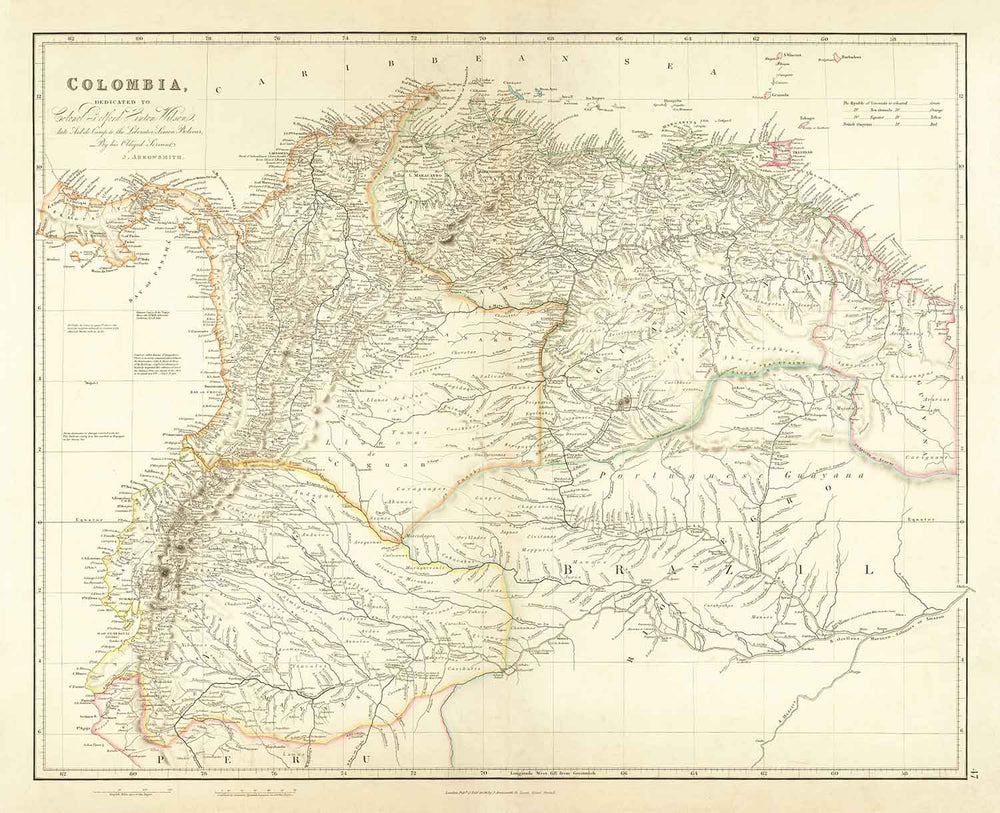 Une magnifique carte de la Colombie et de la Grande Colombie, publiée à l'origine en 1834 par probablement le cartographe le plus recherché du milieu du XIXe siècle, John Arrowsmith.