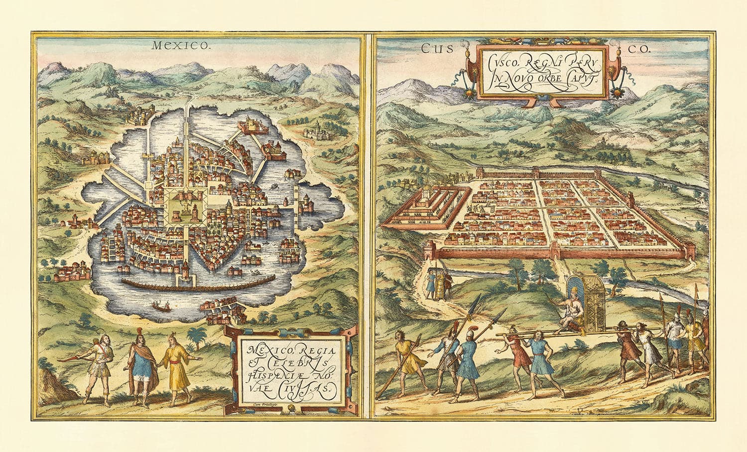 Ancienne Carte de Mexico City & Cusco, 1572 par Georg Braun: Aztèque, Pérou, TexcoCo, TenochTitlan, Colonialisme espagnol