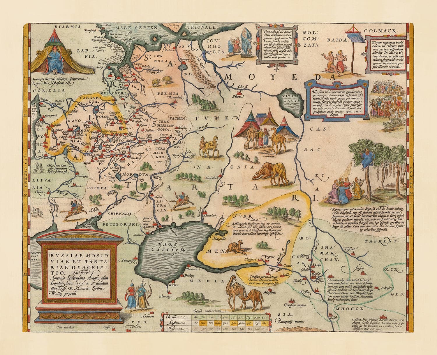 Sur le côté gauche de la carte se trouve la Russie occidentale (appelée ici Moscoviae) avec la capitale Moscou. Au sud se trouve la mer Caspienne et les régions modernes du Turkménistan et de l'Ouzbékistan. Le bord est de la carte se trouve quelque part au Kazakhstan, et le bord nord-est se trouve quelque part en Sibérie.
