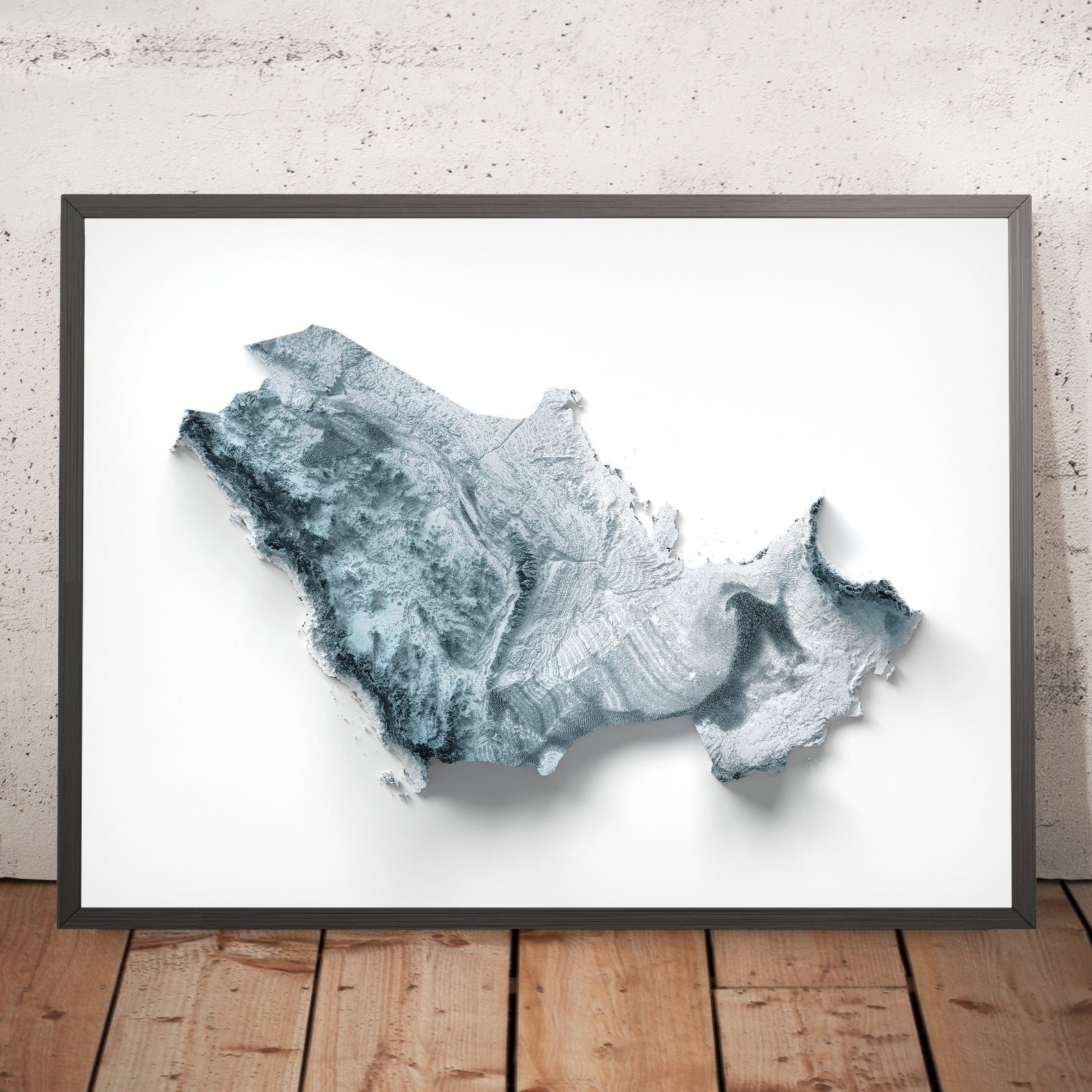This is a minimalist topographical relief map of the Gulf countries, created by The Unique Maps Co. and enhanced with our trademarked Unique 3D process. There are no labels, no roads, and no towns — the landforms speak for themselves. Raking light and delicate shadow reveal the region’s sweeping deserts, serrated mountains, fossil plateaus, and coastal flats, letting you trace familiar horizons and rediscover the shapes that define life along the Gulf.