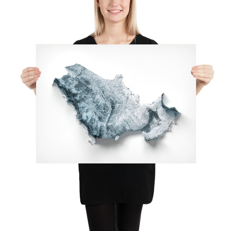 Our shaded relief prints use ultra high resolution topographic data and a secret 3D rendering process to create the illusion of raised terrain — like the mountains are about to lift right off the page. No labels, no borders, no distractions. Just the raw shape of the land, brought to life in a clean, modern style.