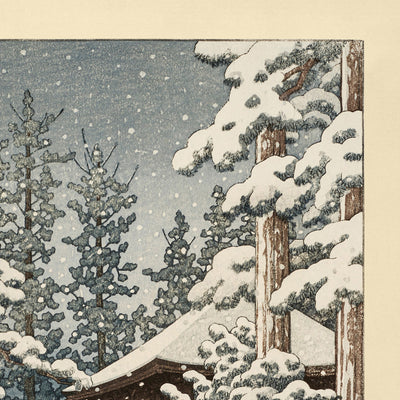 Hasui Kawase, maître des estampes japonaises, est célébré pour ses paysages profondément atmosphériques et évocateurs. Son travail capture fréquemment la beauté éphémère des environnements naturels et bâtis du Japon, chaque scène étant comme une fenêtre sur un autre temps. "Le Hall Konjiki à Hiraizumi" met en valeur la capacité signature de Kawase à transmettre la sérénité et un drame subtil, en utilisant une palette tranquille dominée par des blancs, des bleus doux et des bruns terreux, capturant la beauté envoûtante de ce site sacré sous une couverture hivernale.